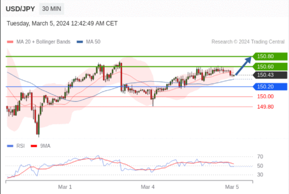 在 150.20 之上,看涨,目标价位为 150.60 ,然后为 150.80 。