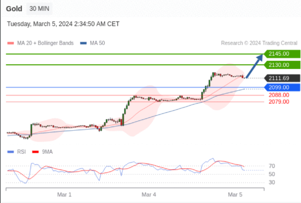 在 2099.00 之上,看涨,目标价位为 2130.00 ,然后为 2145.00 。