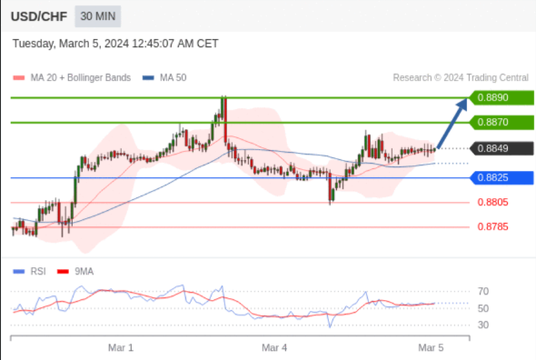 在 0.8825 之上,看涨,目标价位为 0.8870 ,然后为 0.8890 。