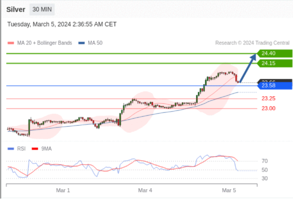 在 23.58 之上,看涨,目标价位为 24.15 ,然后为 24.40 。