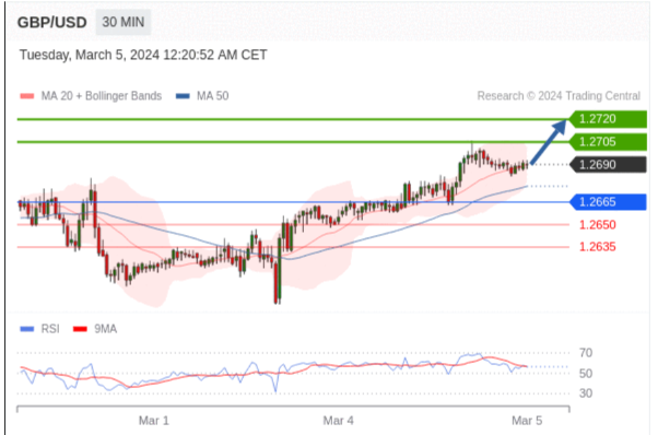 在 1.2665 之上,看涨,目标价位为 1.2705 ,然后为 1.2720 。