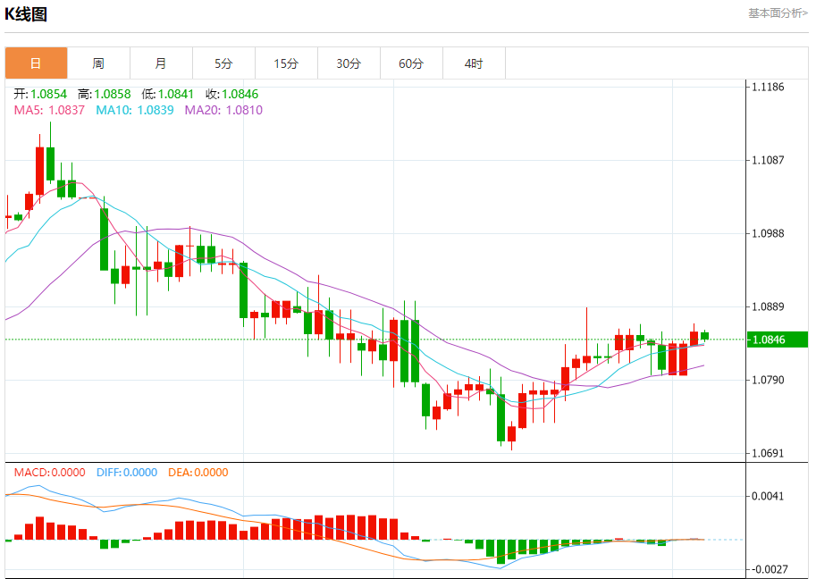 汇价高见1.0858,低见1.0841。上一交易日,汇价收于1.0855。