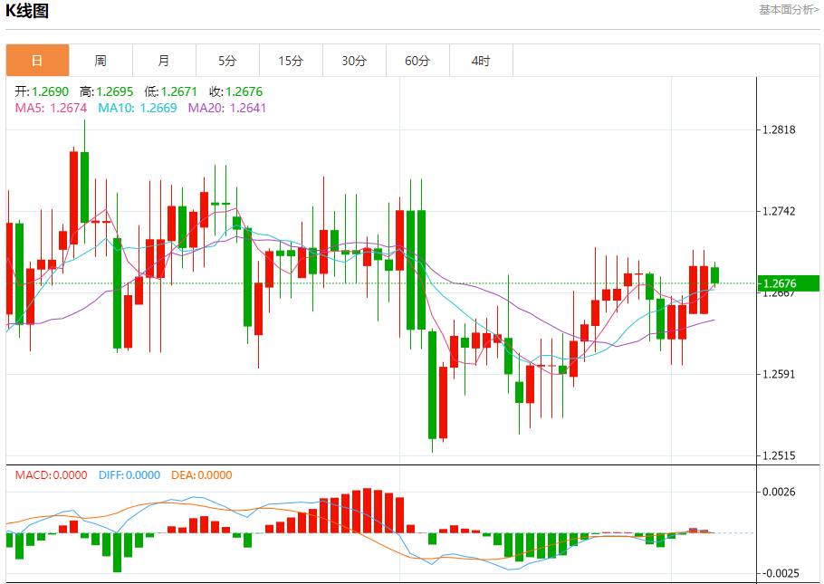 汇价高见1.2695,低见1.2671。上一交易日,汇价收于1.2691。