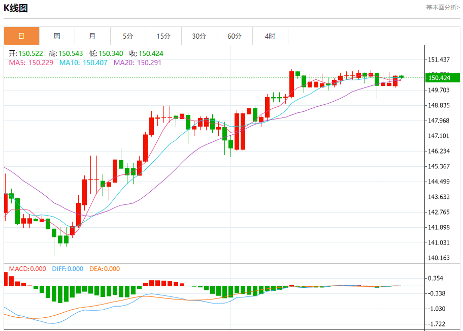 汇价高见150.543,低见150.340。上一交易日,汇价收于150.521。