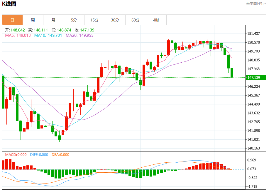 汇价高见148.113,低见146.873。上一交易日,汇价收于148.039。
