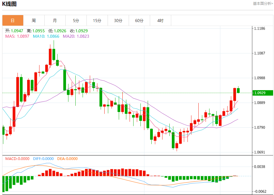 汇价高见1.0955,低见1.0926。上一交易日,汇价收于1.0948。