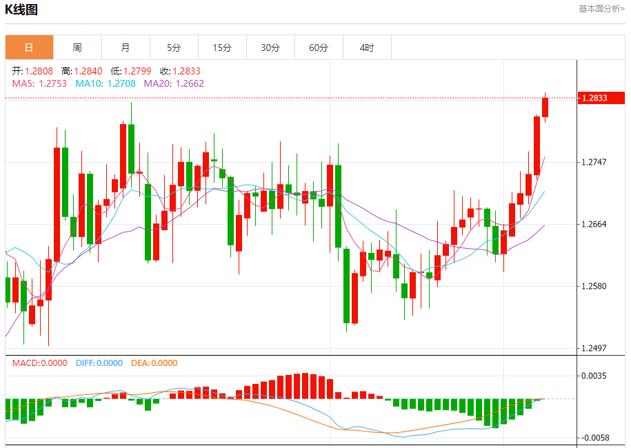 汇价高见1.2840,低见1.2799。上一交易日,汇价收于1.2808。