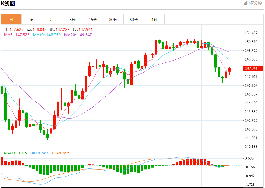汇价高见148.042,低见147.229。上一交易日,汇价收于147.608。