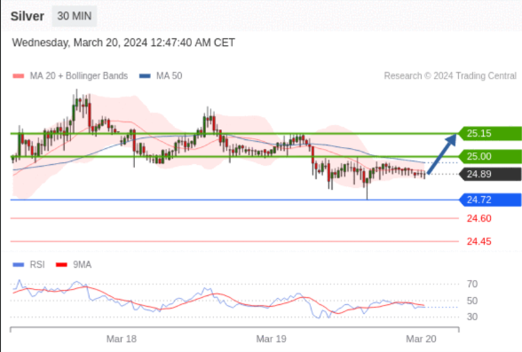 在 24.72 之上,看涨,目标价位为 25.00 ,然后为 25.15 。