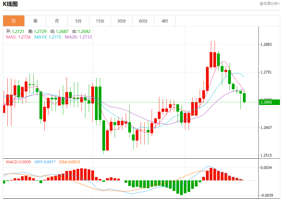 汇价高见1.2729,低见1.2687。上一交易日,汇价收于1.2721。