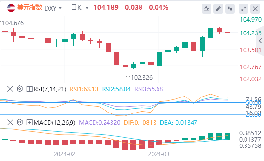 美元指数周一下跌0.21%,报104.22。美元指数上周五一度升至104.49,为2月16日以来最高。