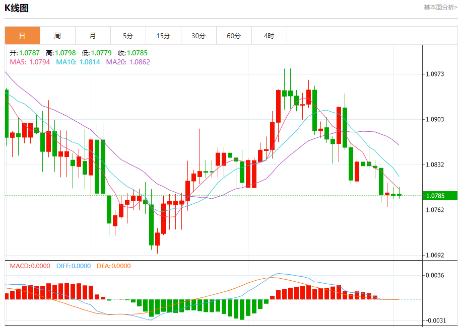 汇价高见1.0798,低见1.0779。上一交易日,汇价收于1.0789。