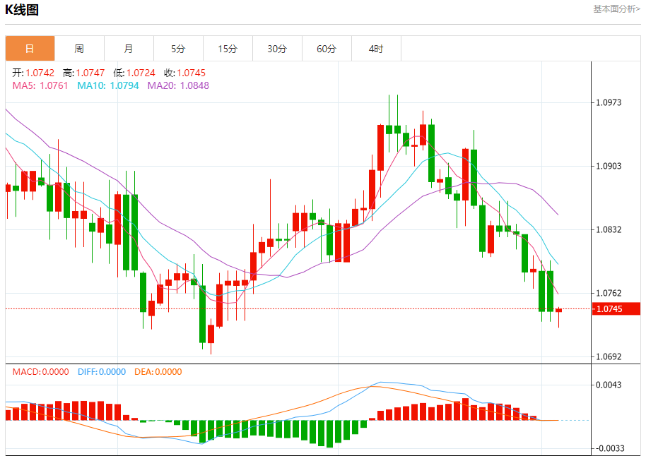 汇价高见1.0747,低见1.0724。上一交易日,汇价收于1.0742。
