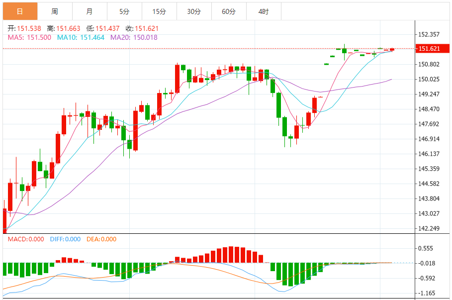 周三(4月3日),美元/日元上涨,暂报151.631,涨幅0.05%。