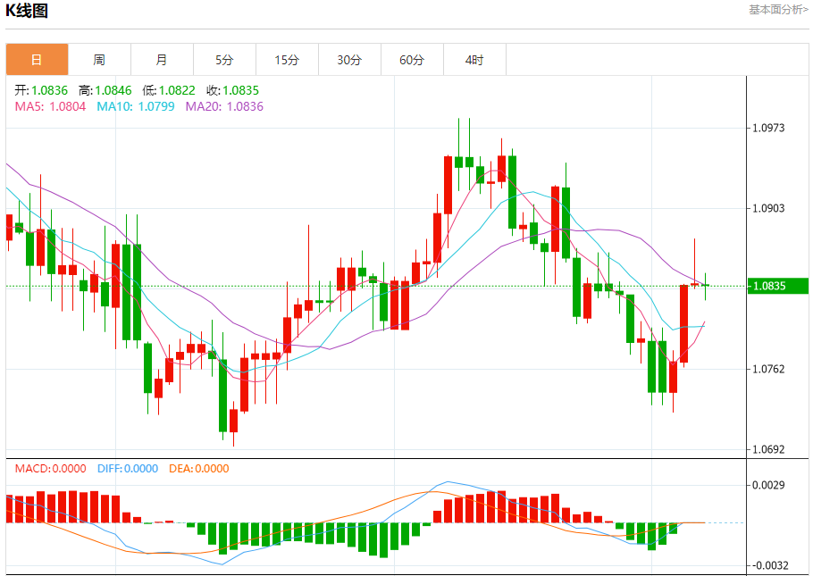 汇价高见1.0846,低见1.0822。上一交易日,汇价收于1.0837。