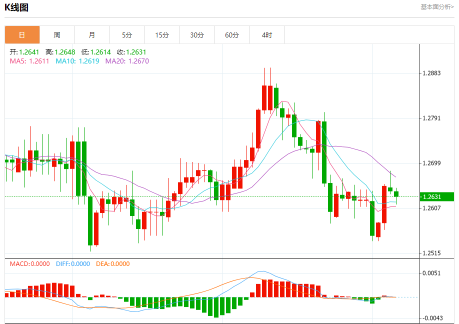 汇价高见1.2648,低见1.2614。上一交易日,汇价收于1.2642。