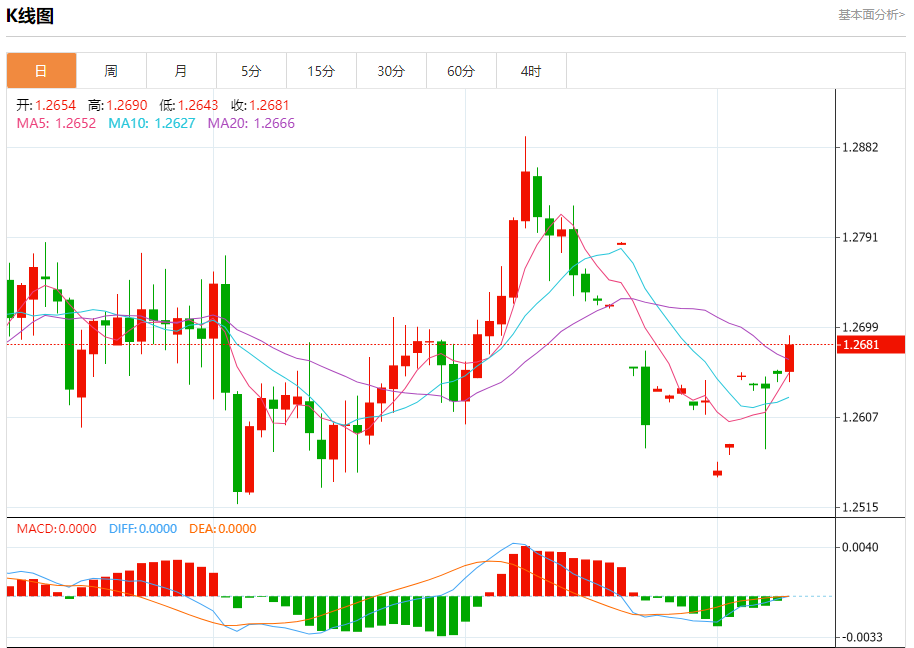 汇价高见1.2690,低见1.2643。上一交易日,汇价收于1.2654。