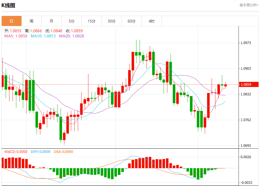 汇价高见1.0866,低见1.0848。上一交易日,汇价收于1.0857。