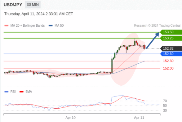 在 152.60 之上,看涨,目标价位为 153.25 ,然后为 153.50 。