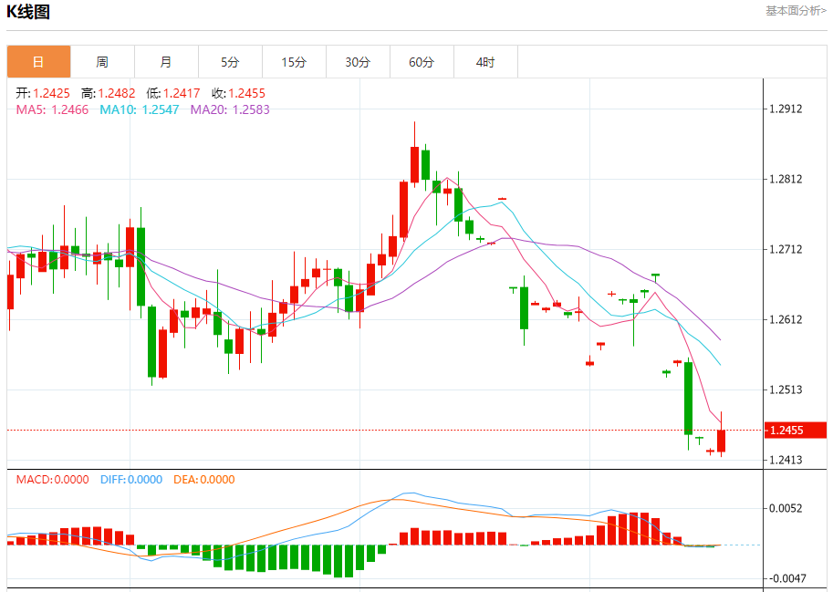 汇价高见1.2482,低见1.2417。上一交易日,汇价收于1.2426。
