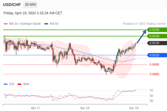 在 0.9110 之上,看涨,目标价位为 0.9140 ,然后为 0.9150 。