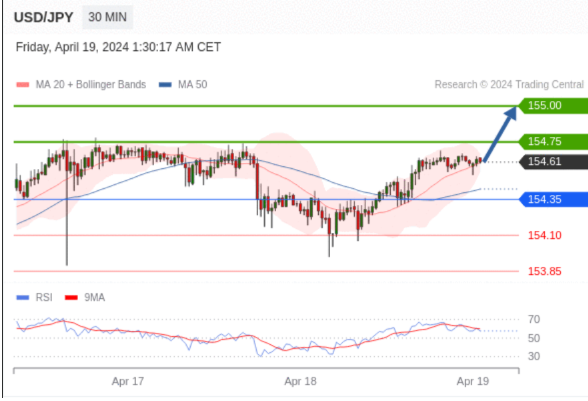 在 154.35 之上,看涨,目标价位为 154.75 ,然后为 155.00 。