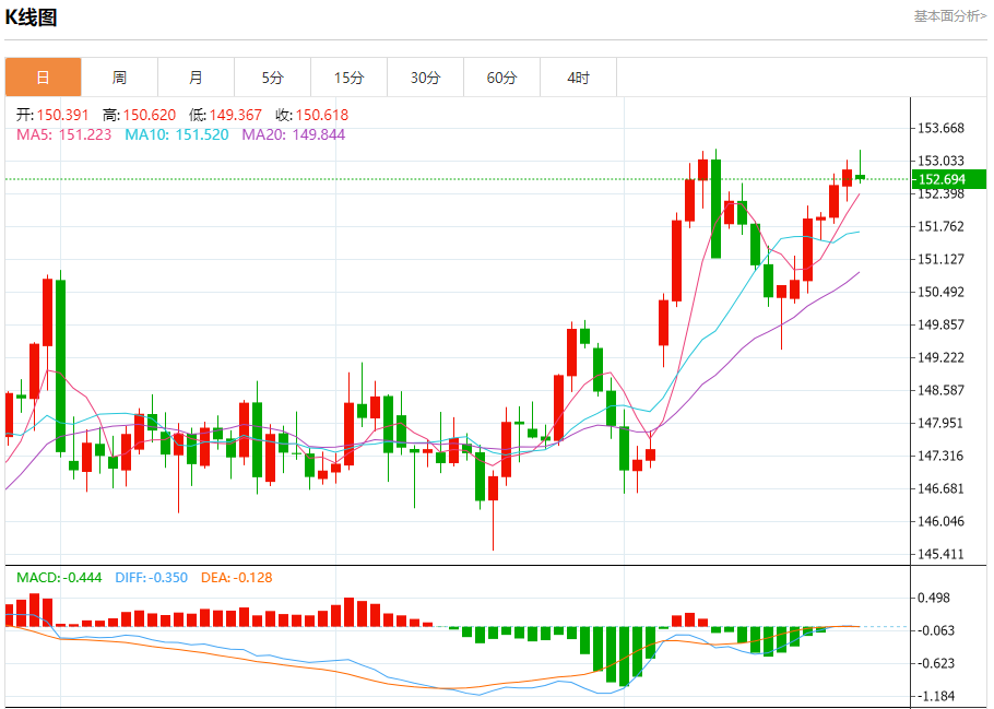 汇价高见153.243,低见152.585。上一交易日,汇价收于152.860。