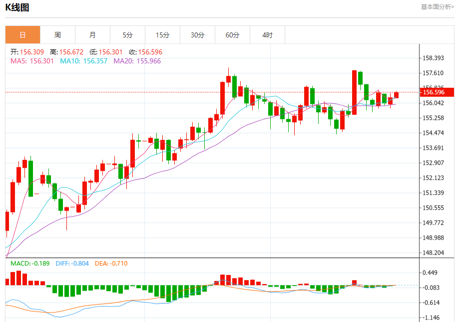 汇价高见156.672,低见156.301。上一交易日,汇价收于156.326。