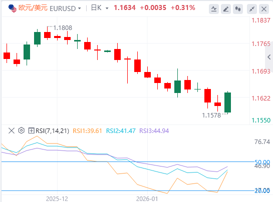尽管如此,上周美国劳动力市场数据的改善使美联储进一步降息的预期推迟至六月。这反过来有助于限制美元的跌幅。根据芝加哥商品交易所FedWatch工具,金融市场目前预计2026年1月27日至28日FOMC会议基准利率几乎有95%的概率不变。
