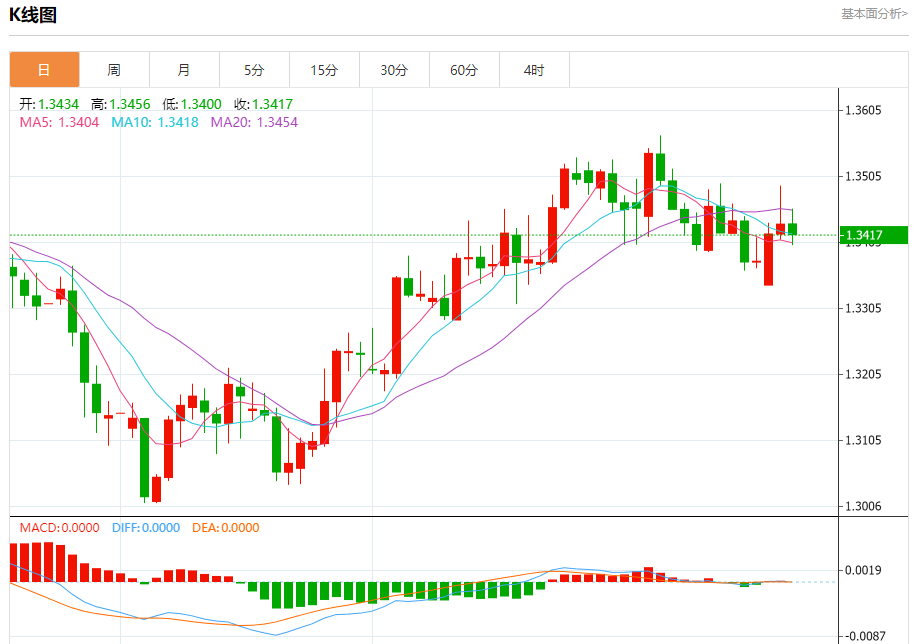 汇价高见1.3456,低见1.3401。上一交易日,汇价收于1.3433。