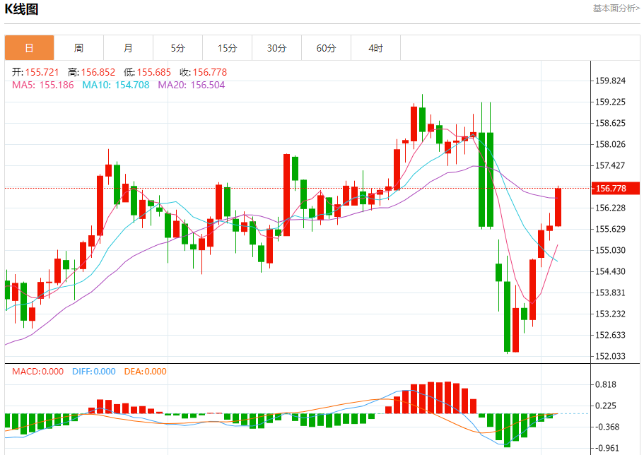 汇价高见156.852,低见155.685。上一交易日,汇价收于155.722。