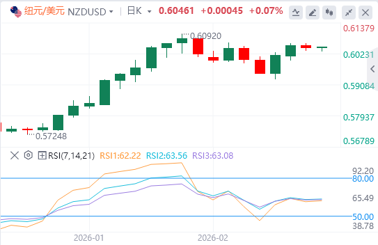 纽元在日线图上呈现明显的上涨趋势,价格在50指数移动平均线(EMA)0.5874和200指数均线0.5845上方,此前从11月底近0.5580的低点强劲反弹。纽元兑美元在1月底曾创下0.6094的高点,随后过去两周进入约0.6000至0.6094的盘整阶段,周一交易日收于0.6043,当天下跌0.21%。