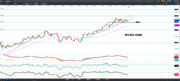 澳元/美元日线图显示 澳美货币对重新回到上行趋势线之上 日内有望保持上行动能 潜在阻力位置首看1月7日高点0.78关口若突破则进一步的潜在上行目标在0.7860(斐波那契延展线50.0%回荡线). 同时近期的潜在支持集中在0.7670附近(38.20%回荡线).