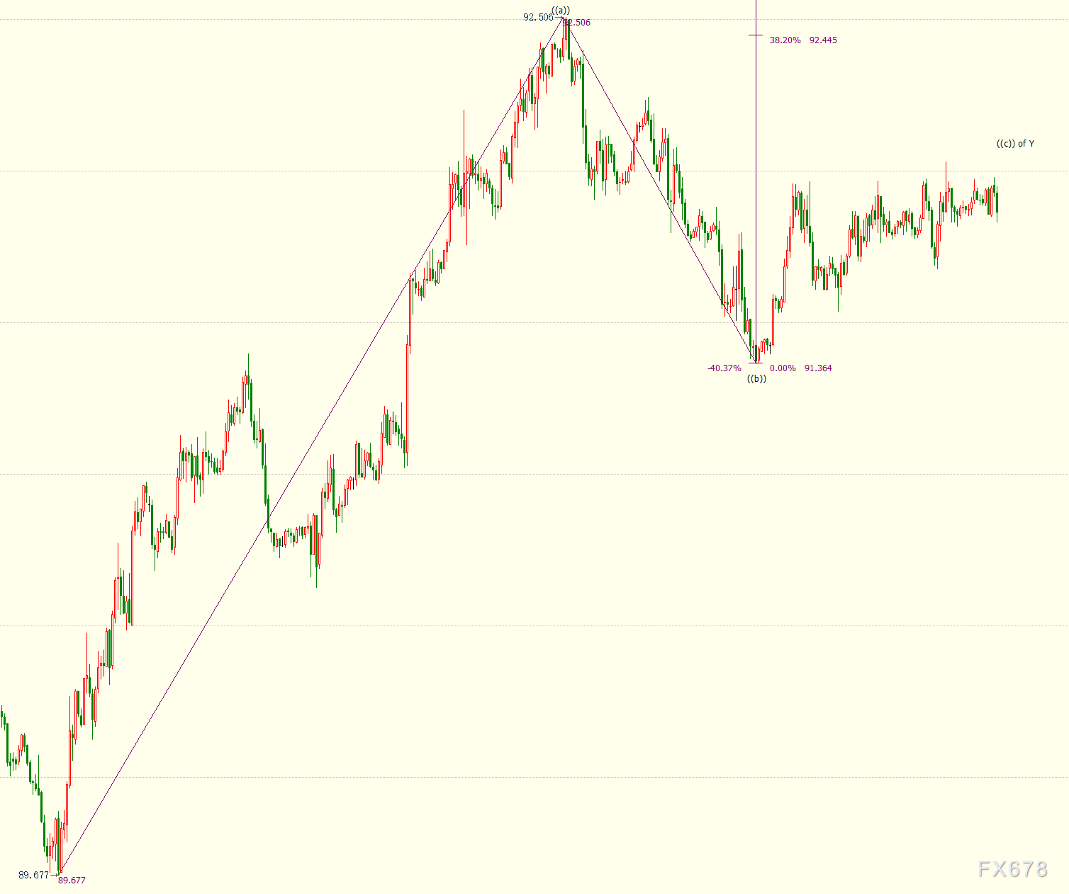 小时图上看,美元指数处于自91.36开启的上行((c))浪,上方阻力看向38.2%目标位92.46。((c))浪是Y浪的子浪。