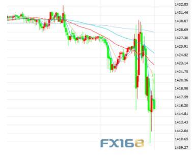 现货黄金跌超1.3%,最低触及1410.38美元/盎司,现回升至1418美元/盎司附近交投。