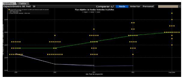 点阵图显示,2019年余下时间和2020年都预期不会再降息,而且没有一位官员预计,此后直到2022年会进一步降息,即没有官员预计2022年之前美联储会降息至1.625%下方。