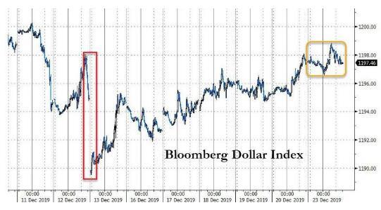 美元兑一篮子货币周一几无变动,在圣诞假期淡静的交投中持于两周高位附近。衡量美元兑六种主要货币的美元指数微跌0.03%,报97.65。该指数上周五上涨0.3%,受此前发布的较强劲经济数据提振。