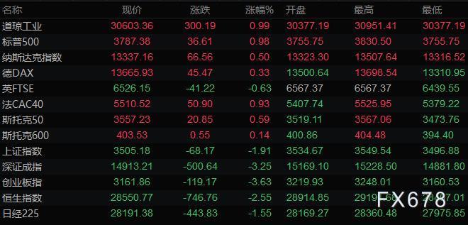 美股三大指数集体收涨,标普500指数收盘上涨36.60点,涨幅0.98%,报3787.37点;纳斯达克指数收盘上涨66.60点,涨幅0.50%,报13337.16点;道琼斯指数收盘上涨299.80点,涨幅0.99%,报30603.00点。