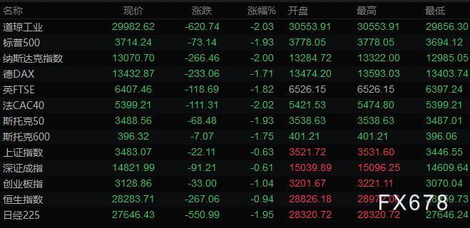 美股大跌,道琼斯指数收盘下跌620.70点,跌幅2.03%,报29982.68点;标普500指数收盘下跌73.10点,跌幅1.93%,报3714.26点;纳斯达克指数收盘下跌266.50点,跌幅2.00%,报13070.69点。