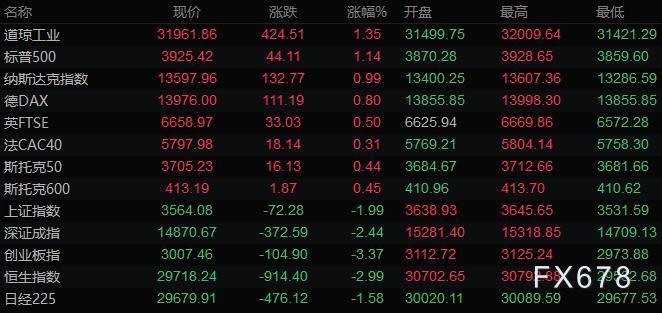 美股三大指数低开高走,道指再创历史新高。道琼斯指数收盘上涨424.50点,涨幅1.35%,报31961.86点;标普500指数收盘上涨44.10点,涨幅1.14%,报3925.43点;纳斯达克指数收盘上涨132.80点,涨幅0.99%,报13597.97点。