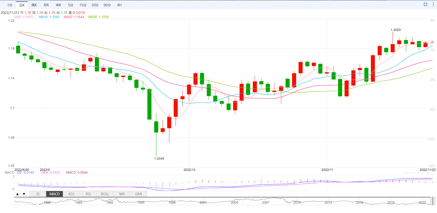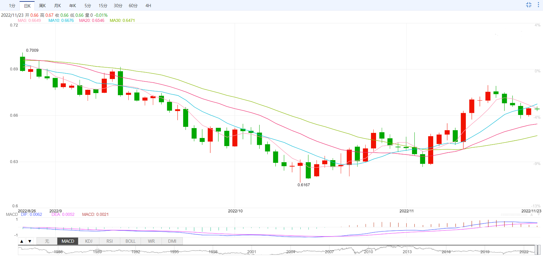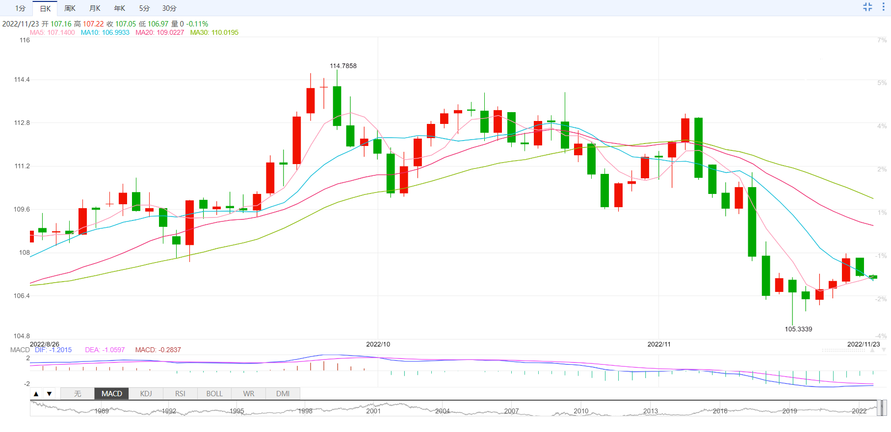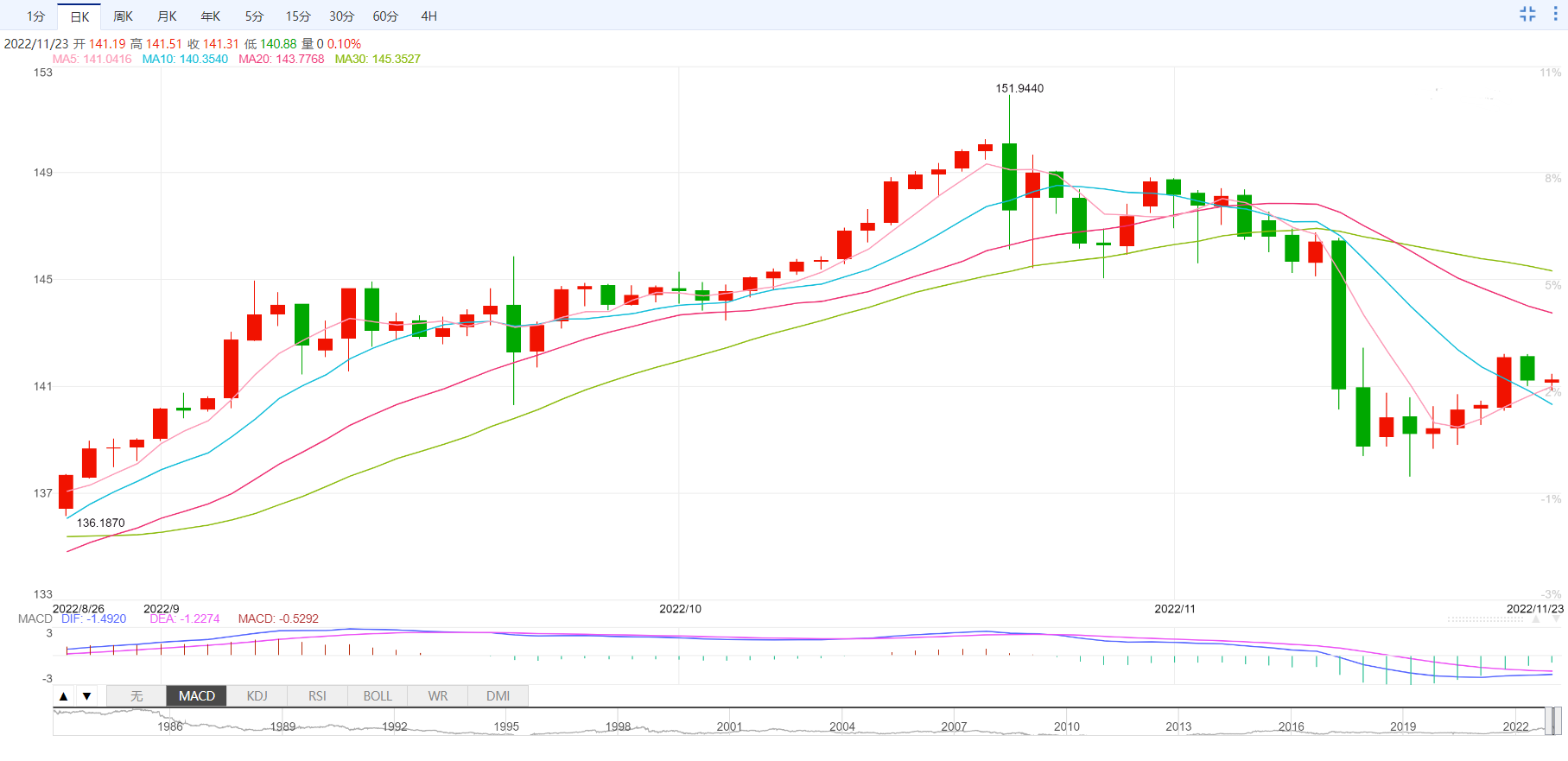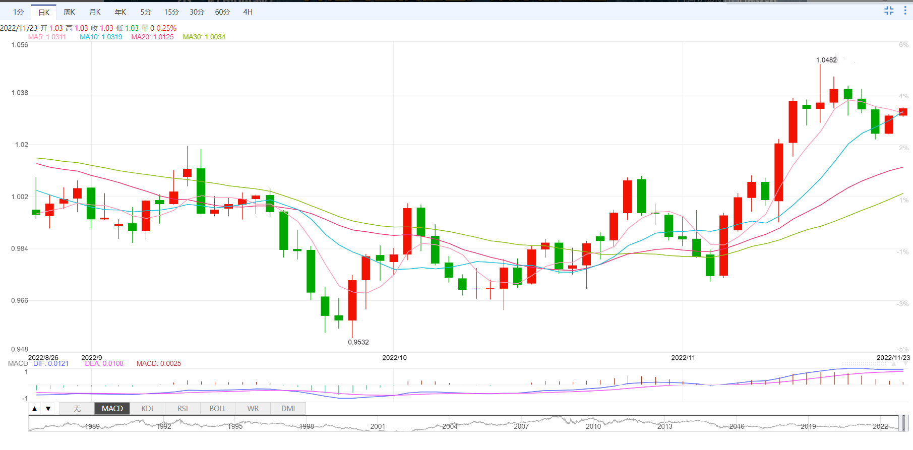 周三盘中,美元指数下跌至107.04,跌幅0.11%;欧元兑美元上涨至1.0328,涨幅0.25%;英镑兑美元上涨至1.1889,涨幅0.01%;美元兑日元上涨至141.32,涨幅0.09%;澳元兑美元上涨至0.6642,涨幅0.01%。