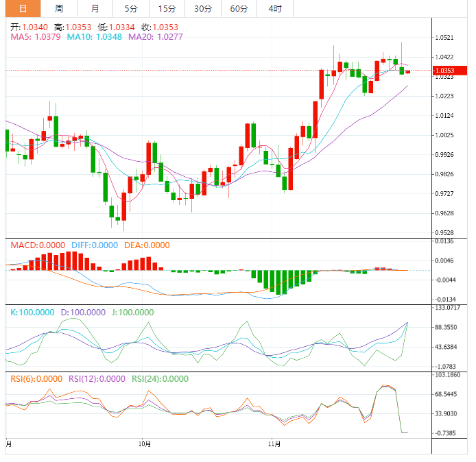 美元守住了200日均线的关键位置支撑,也是近三个月低点支撑所在,并在该附近展开反弹,留下了较长的下影线,增加了短线见底信号,后市美元有望转向多头。美元兑日元下跌0.18%,至138.92。欧元下跌0.44%,至1.0339美元,盘中早些时候一度涨至1.0496,为近五个月新高。澳元兑美元周一大跌1.42%至0.6651。澳元走势与亚洲大国经济增长密切相关。而且数据显示,由于物价上涨和利率上升似乎最终对支出产生了影响,澳洲10月零售销售遭遇2022年以来的首次下跌,这也使该货币受到了影响。