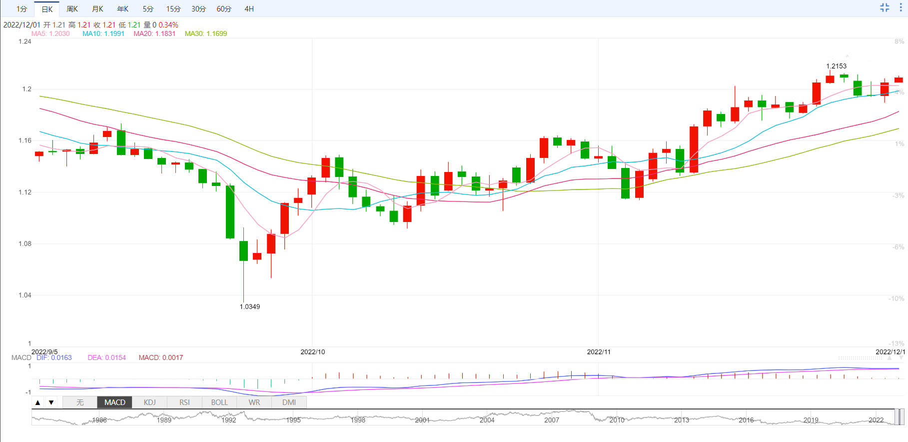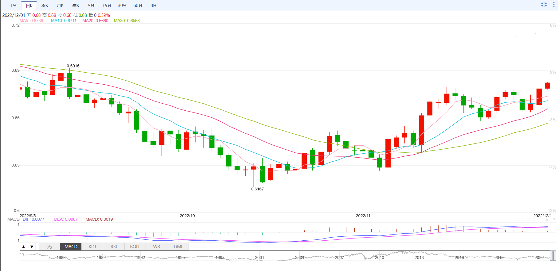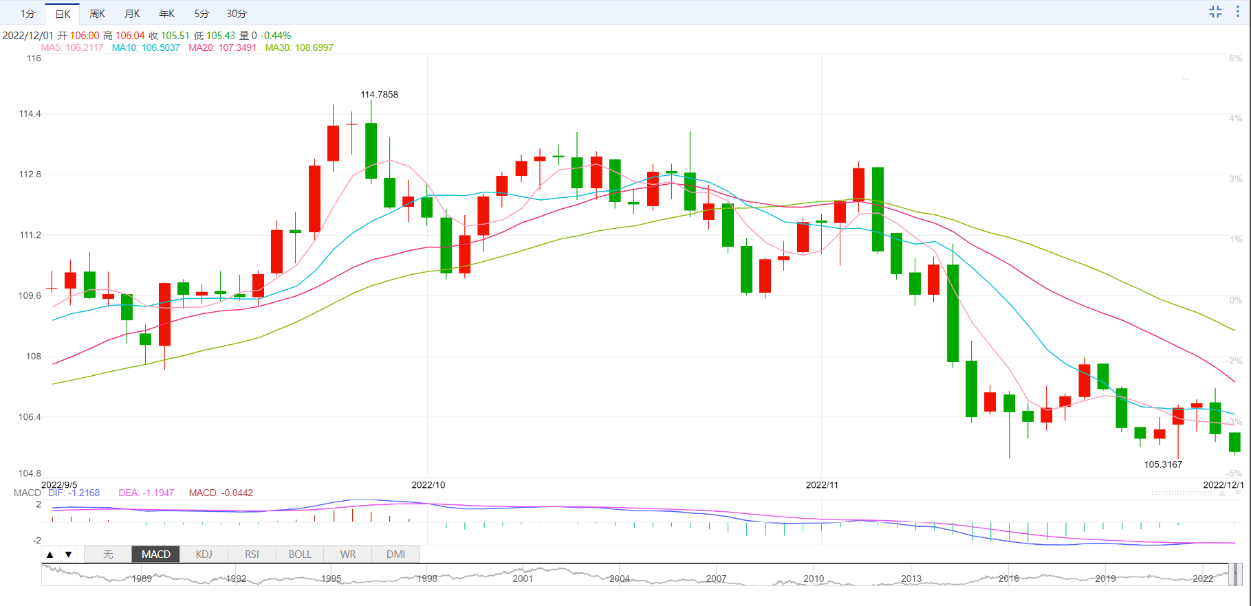 周四盘中,美元指数下跌至105.50,跌幅0.44%;欧元兑美元上涨至1.0445,涨幅0.38%;英镑兑美元上涨至1.2096,涨幅0.34%;美元兑日元下跌至136.38,跌幅1.23%;澳元兑美元上涨至0.6826涨幅0.59%。