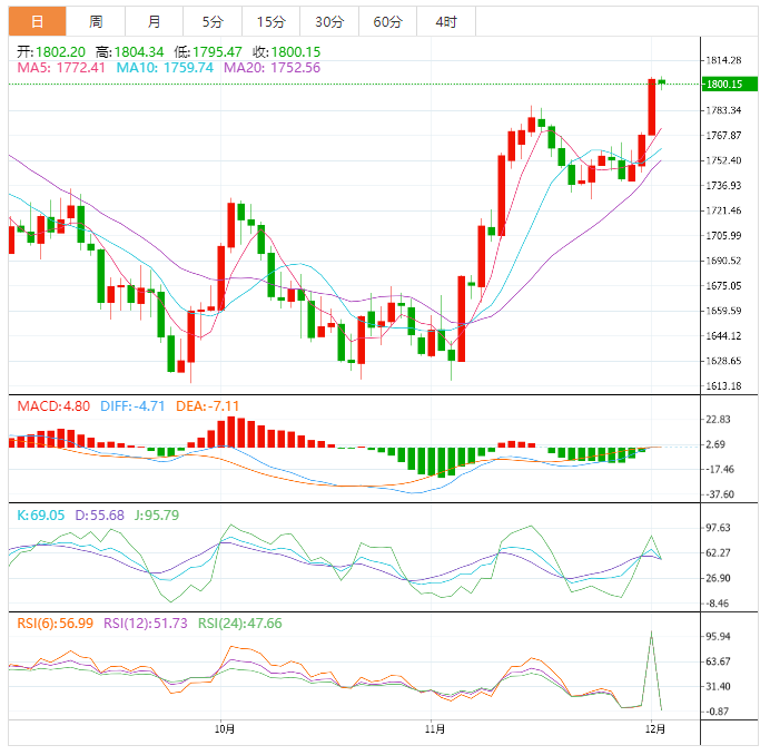 现货黄金:截止发稿,现货黄金小幅下跌,现报1800.09,跌幅0.15%,欧市盘前,黄金/美元位于4个月高点附近,目前小幅下跌挑战近期的三日昇势,市场等待週五北美时段早盘公佈的关键非农报告。除了数据前的焦虑,对美联储(FED)下一步行动的最新鸽派倾向的反思,以及国际货币基金组织(IMF)的负面风险头条似乎也对黄金买家产生了影响。
