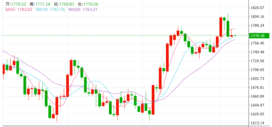 周二(12月6日),现货黄金一度触及1780美元,美股尾盘几乎抹去全部涨幅并一度失守1770关口,最终收涨0.12%,报1771美元/盎司。现货白银失守23美元关口,收跌0.28%,报22.19美元/盎司。