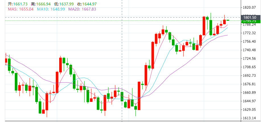 上周五(12月9日),现货黄金盘中突破1800大关,最高升至1806.05美元/盎司,但收盘未能收在1800关口上方,收涨0.47%,报1797.46美元/盎司;现货白银最高升至23.68美元/盎司,收涨1.75%,报23.48美元/盎司。