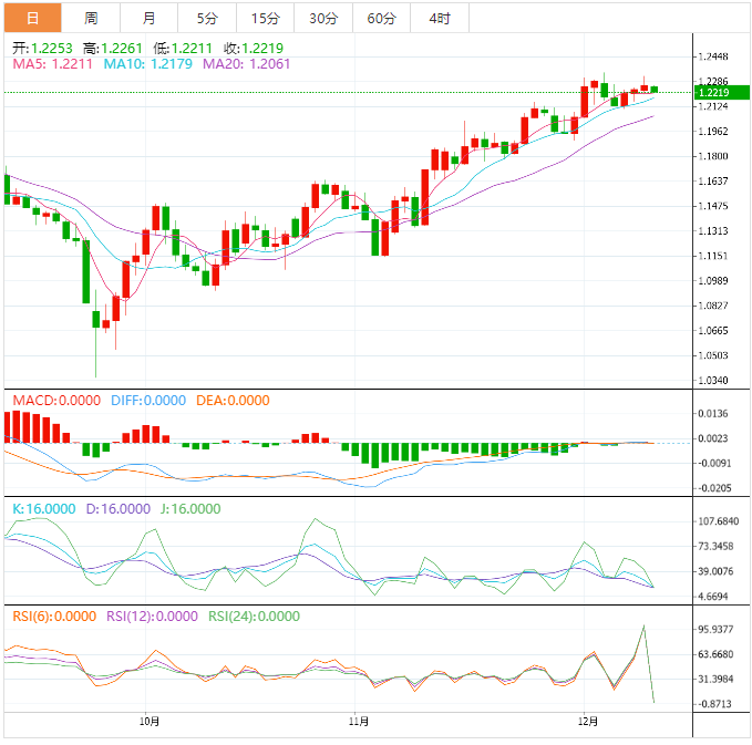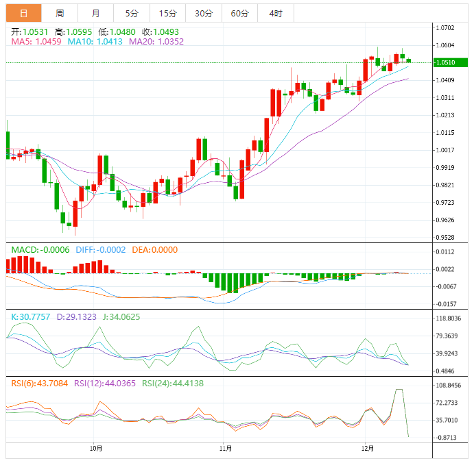 周一亚洲时段,美元指数震荡微涨,目前交投于105.18附近,在上周五探底回升后,汇价出现企稳迹象,本周有望迎来反弹机会;不过,本周将迎来美联储利率决议、英国央行利率决议、欧洲央行利率决议,还有美国11月CPI、11月零售销售数据、欧美国家12月PMI数据,可谓是一个超级周,投资者务必“系好”安全带,提前做好仓位调整。