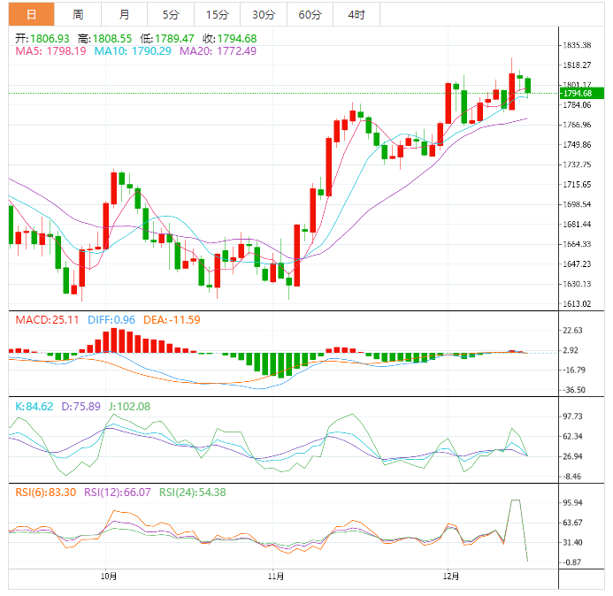 现货黄金:截止发稿,现货黄金震荡,现报1794.91,跌幅0.68%。欧市盘前,金价已失手美联储决议引发的震盪低点1,795.50美元,料继续承压。标普500指数期货回吐东京时段早盘的全部涨幅,因为美联储主席鲍威尔尚未确认通胀峰值。展望未来,投资者将关注週四公佈的美国零售销售数据,预计11月零售销售下降0.1%,前值增长1.3%。零售销售下降可能支持金价。