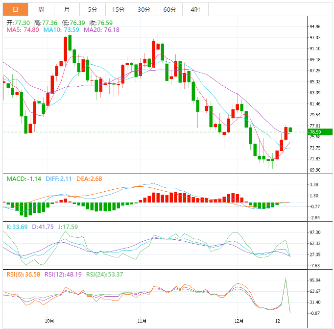 美原油:截止发稿,美原油大幅震荡,现报76.60,跌幅0.10%。欧市盘中,WTI原油期货因对全球经济复苏前景的期待,连续3个交易日呈现出上涨趋势。由美联储放弃了更大的利率机制,油价在上周创下70.61美元的年度新低后大幅回升,攀升至每桶77.5美元以上。油价并未对美国官方机构报告的石油库存稳步增加做出太大反应。美国能源情报署(EIA)报告称,截至2009年12月当周,美国石油库存增加了1023.1万桶。
