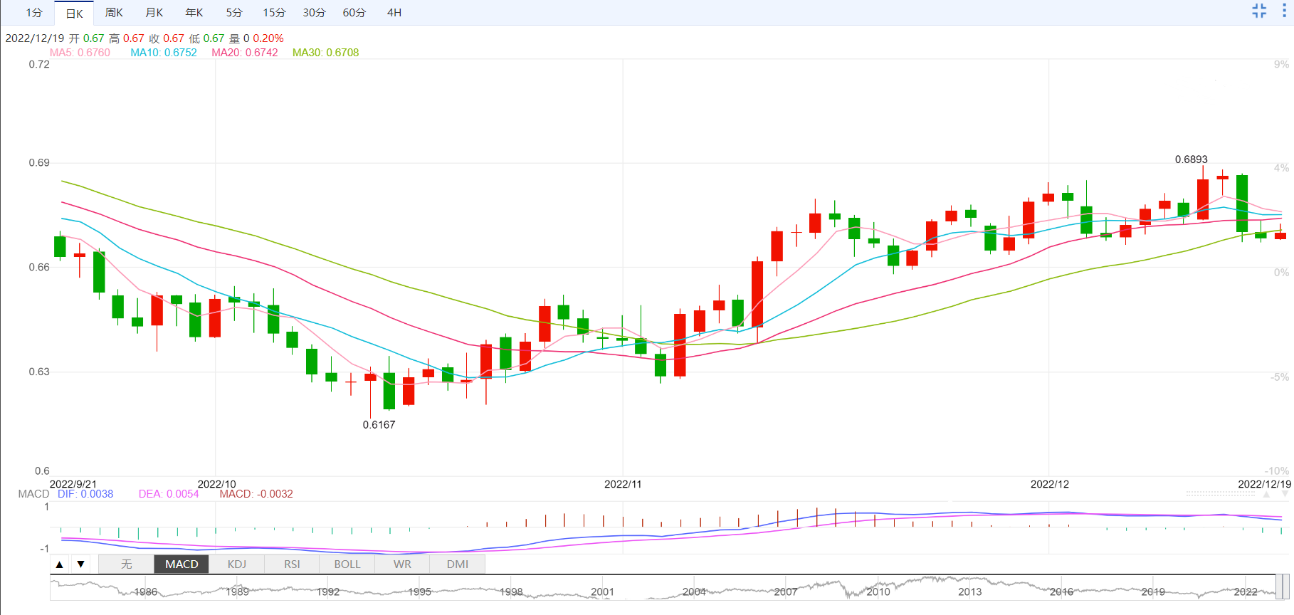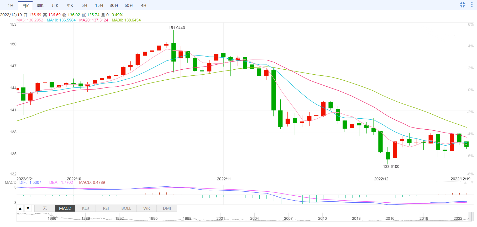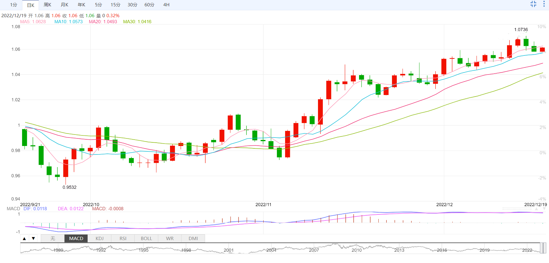 周一盘中,美元指数下跌至104.51,跌幅0.32%;欧元兑美元上涨至1.0617,涨幅0.30%;英镑兑美元上涨至1.2178,涨幅0.35%;美元兑日元下跌至136.01,跌幅0.48%;澳元兑美元上涨至0.6698,涨幅0.19%。